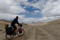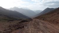 Egy újabb bringás jött szembe, de a homokviharban épp csak egy percre álltunk meg, hogy üdvözöljük egymást. Szavait alig hallottam, de mindkettőnk tekintetében benne volt az az elismerő kifejezés, ami a semmi közepén egy ilyen találkozás alkalmával többet ér minden szónál. Egy kisebb folyón kellett átgázolnom, mert annak hídját az áradás tavasszal elvihette. Ezt követően 4 km/h sebességgel húztam-vontam a bringát a tádzsik határig. Itt megkaptam a kilépő pecsétet az országból. A történet ezen a napon azonban még nem ért véget. Majd 100 méter szint várt még rám, mire felértem a Kyzil-Art-hágóba, ami 4280 méter magasan volt. Itt végre átfordultam a hegység északi oldalára, ahol sokkal zöldebb volt minden, de egyben hűvösebb is. A határon a lelkemre kötötték, hogy még ugyanezen a napon érjem el a kirgiz határt, ami 20 kilométerre található innen. Gondoltam, ez nem lesz gond ebbe az irányba, mert innen már csak lefelé kell gurulni.